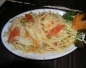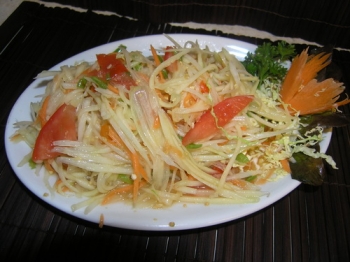 A popular dish from the north eastern regions of Thailand. Made with shredded green papaya or carrots cooked with green beans , chilli , tomatoes , palm sugar , lemon juice and fish sauce.